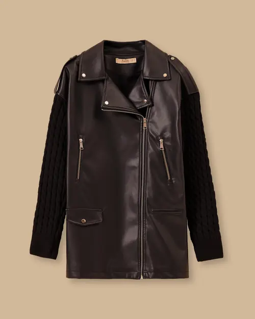 Çift Kumaşlı Cepli Fermuarlı Suni Deri Ceket, modern detayları ve cepleri ile hem şık hem de işlevsel bir tarz sunar. Günlük kombinlerinize güçlü bir hava katar.
