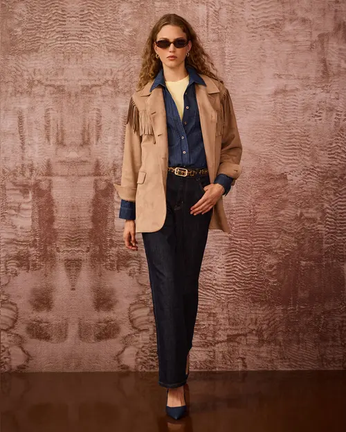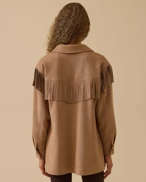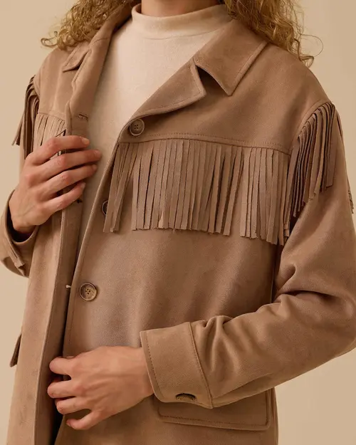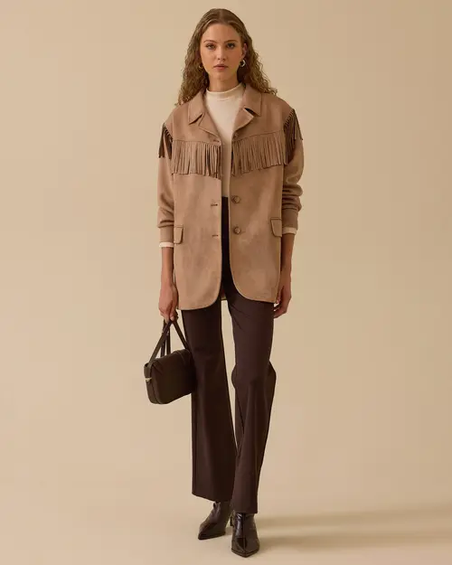 Püskül Detaylı Süet Ceket, yumuşak dokusu ve hareketli tasarımıyla tarzınızı öne çıkarır.