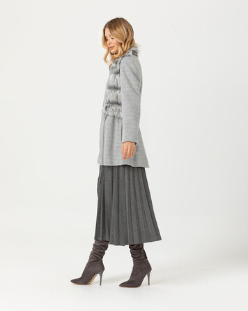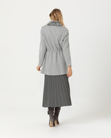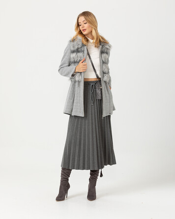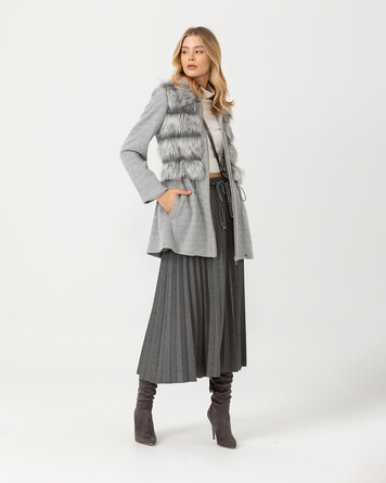 Kürk detayı ve rengi ile konforlu bir görünüm sunan kaban, sezonu yansıtan dokusu ile şık bir görünüm yansıtıyor. Kabanı pliseli eteklerin üzerine kombinlemeyi deneyebilirsiniz.