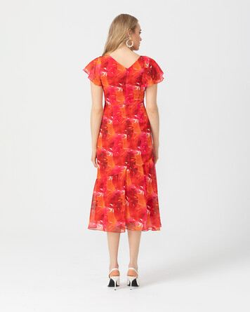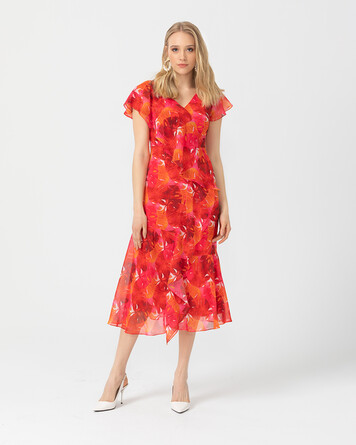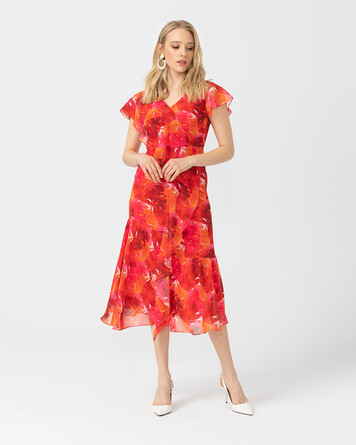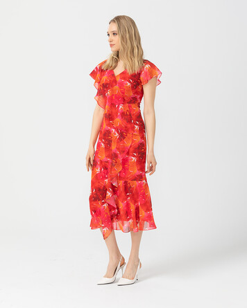 Deseni ve rengi ile tam bir yaz havası yansıtan elbise, volan detayları ile romantik bir duruş sergiliyor. Elbisenizi sandaletler ile kombinleyerek, tek parça şıklığınızı vurgulayabilirsiniz.
