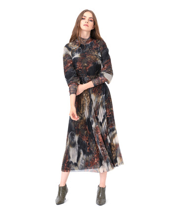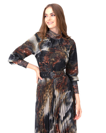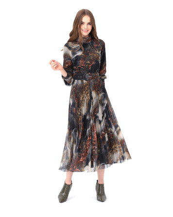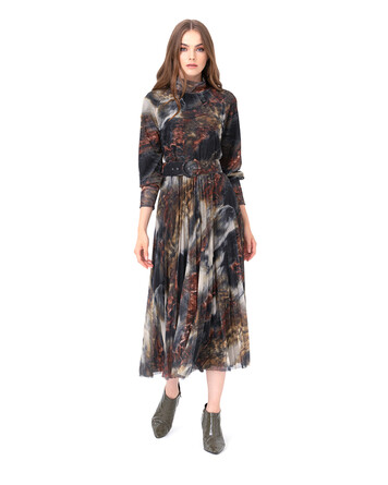 Pliseli formu ve dik yakası ile dikkat çeken elbise, kemeri ile feminenlik kazanıyor. Elbiseyi, topuklu botlar ile kombinleyerek, tek parçada şıklık yaratabilirsiniz.