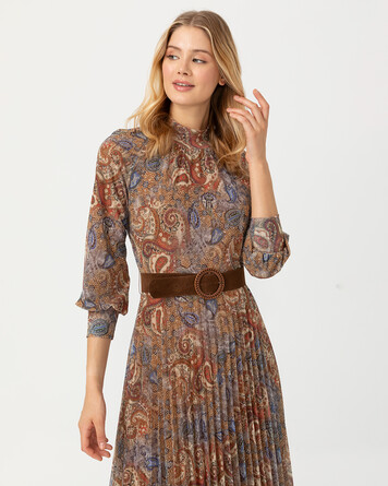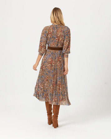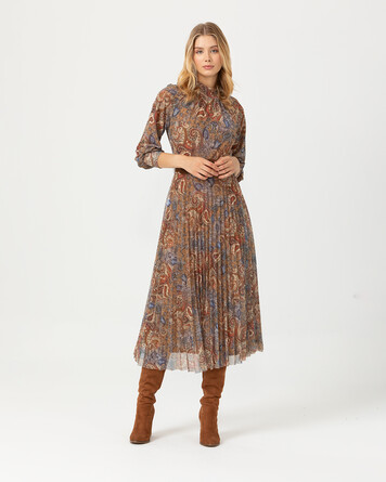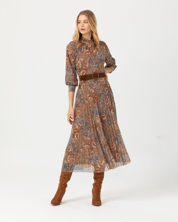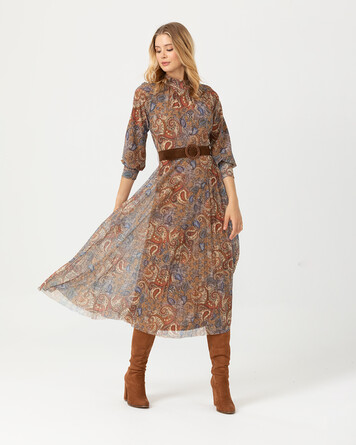 Renkli şal deseni ile dikkat çeken elbise, şifon dokusu ve zamansız formuyla şık bir stil yaratıyor. Elbiseyi, toprak tonlarında topuklu çizme ve botlarla tamamlayarak ideal bir mevsim stili oluşturabilirsiniz.