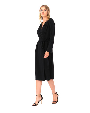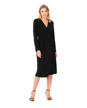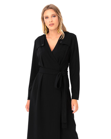 V yaka görünümü ve kruvaze modeli ile basic stillere güçlü bir görünüm katan elbise, kemeri ile bele vurgu yapıyor. Elbiseyi, düz botlar ile günlük kullanıma adapte edebilir, topuklu ayakkabılar ile geceye taşıyabilirsiniz.
