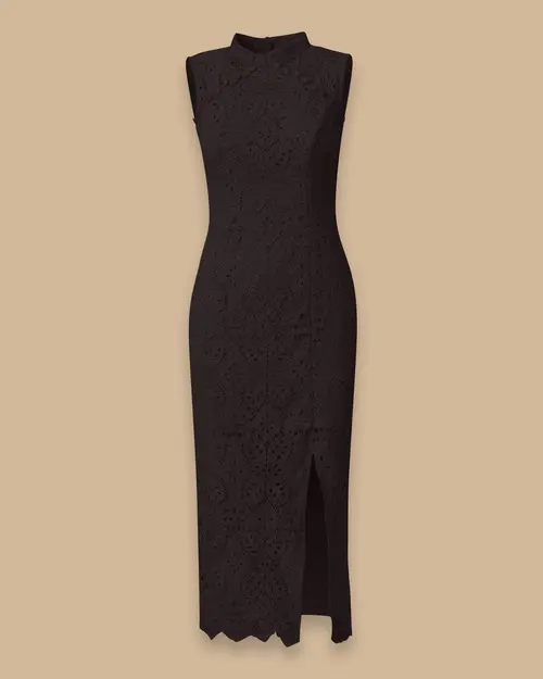 Desenli Yırtmaç Detaylı Şık Dantel Elbise, zarif dantel yapısı ve yırtmaç detayıyla dikkat çeker.