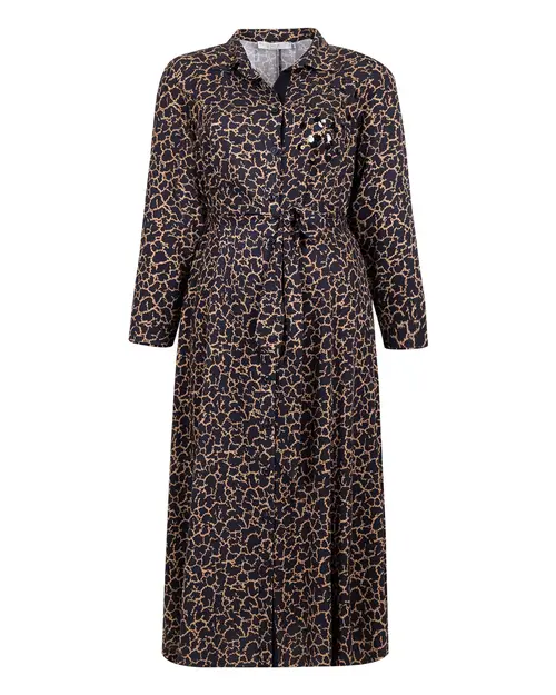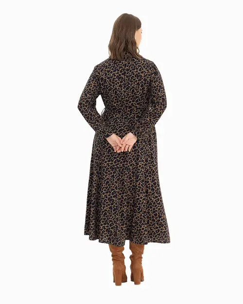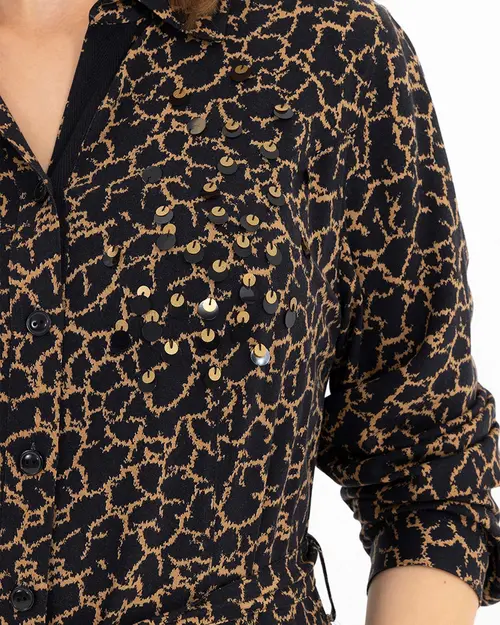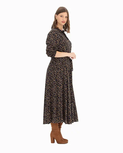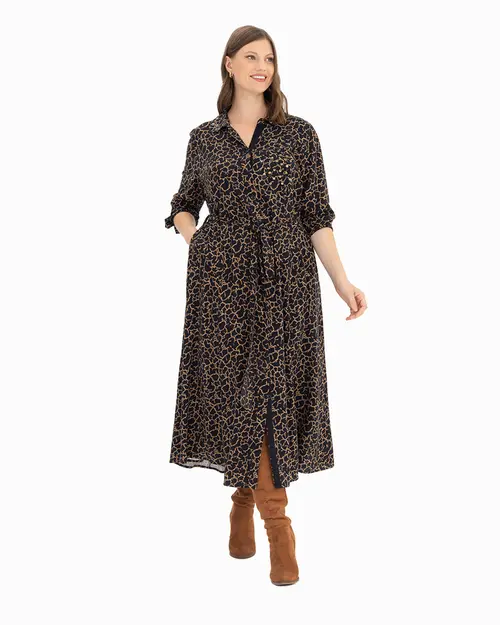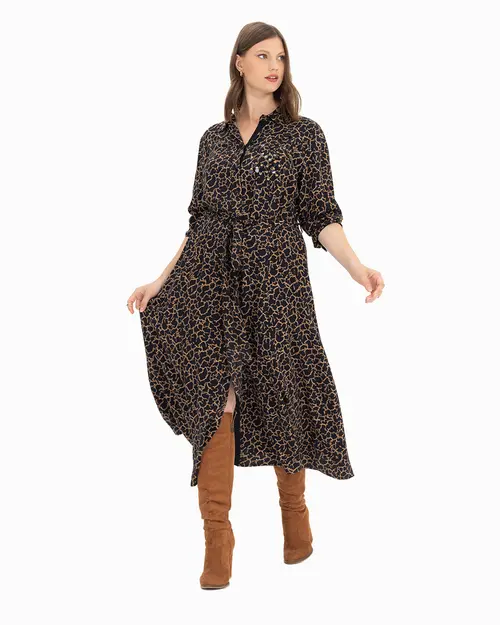 Deseni ile dikkat çeken elbise, pul detayları ile şıklık katıyor. Gömlek formu ve belindeki kemeri ile detaylanan elbiseyi, çizmeler ile tamamlayabilir, tek parçada şık bir stil elde edebilirsiniz.