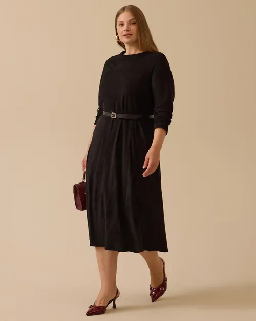 Büyük Beden Yuvarlak Yaka Süet Elbise, yumuşak süet dokusu ve rahat kalıbıyla gün boyu konfor sağlar.