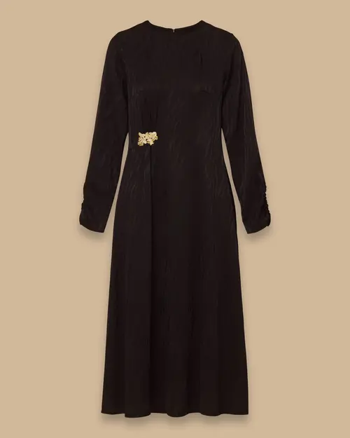 Aksesuarlı Desenli Jakar Elbise, zarif jakar dokusu ve şık aksesuar detayıyla göz alıcı bir stil sunar.