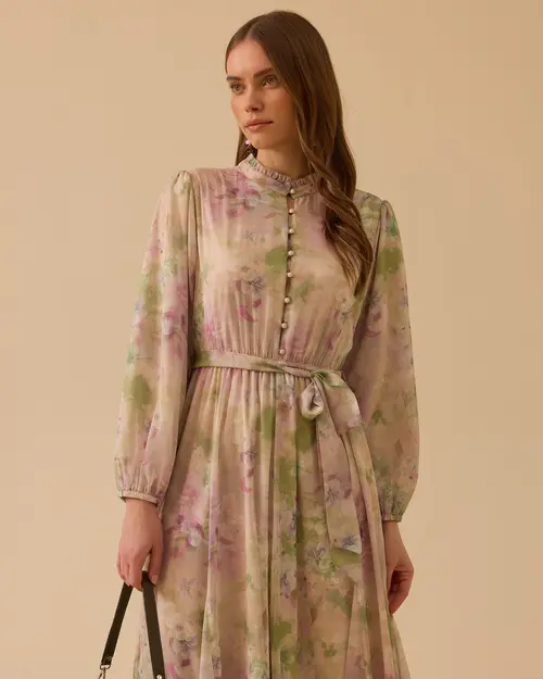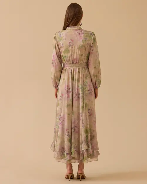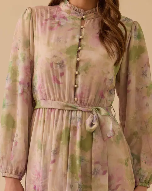 Çiçek Desenli Fırfırlı Şifon Elbise, tek parçada şık bir görünüm sunar.