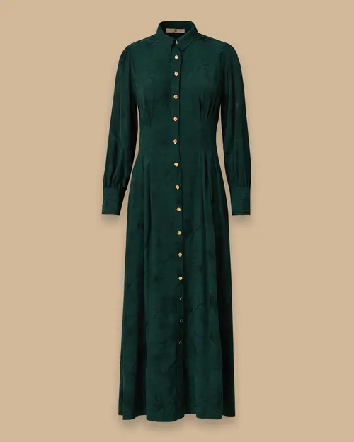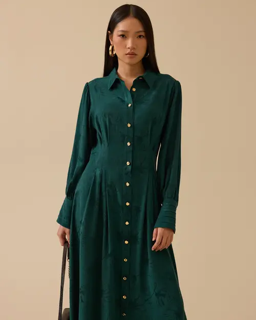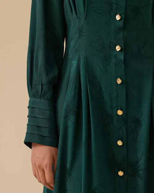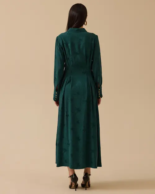 Çiçek Desenli Pile Detaylı Jakar Elbise, zarif kumaş dokusu ve düğmeleriyle öne çıkar.