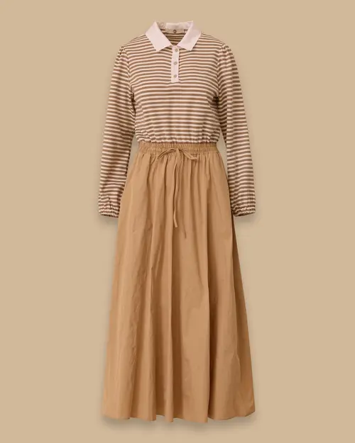 SCL bej çift parça görünümlü elbise, kombin yapma zahmetini ortadan kaldırarak tek parçada 'etek-gömlek' takımı şıklığı sunan inovatif bir tasarımdır. Modest (muhafazakar) giyim çizgisine uygun olarak tasarlanan bu model, 138 cm maksi boyu ve uzun kollu gömlek yaka üst detayıyla ölçülü bir silüet yaratır. Belindeki bağcık ve lastik detayı, çift parça (katmanlı) illüzyonunu güçlendirirken aynı zamanda belinize göre kusursuzca ayarlanabilmesine olanak tanır. A-kesim eteği ile alt bedeni rahat ettirir, %100 polyester kumaşı sayesinde kırışmaya dirençlidir. Doğal bej tonuyla toplantılardan özel buluşmalara kadar zahmetsiz ve rafine bir şıklık yakalamanızı sağlar.