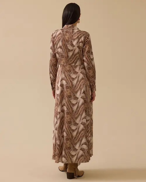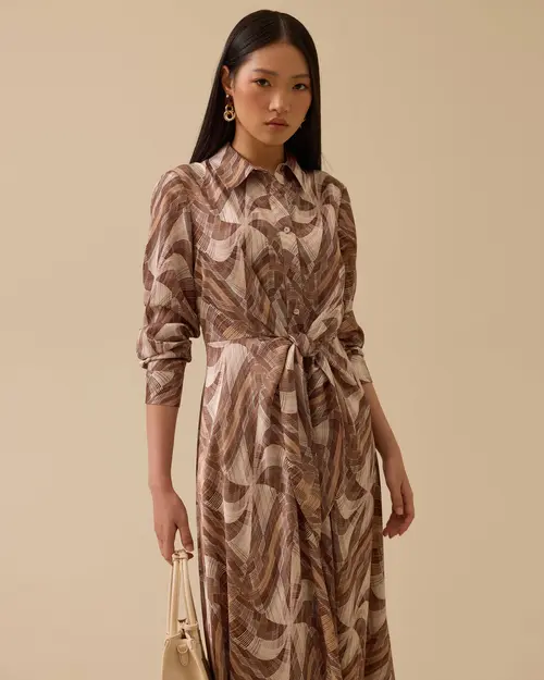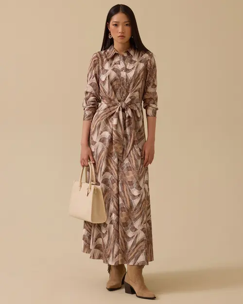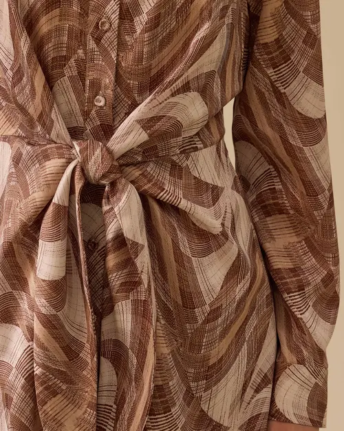 Desenli Bağlama Detaylı Düğmeli Elbise, şık desenleri, ön düğme kapaması ve beldeki bağlama detayıyla zarif ve modern bir stil sunar.