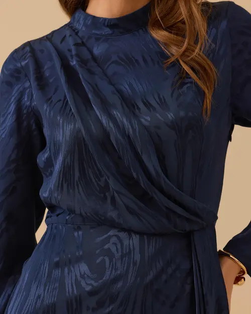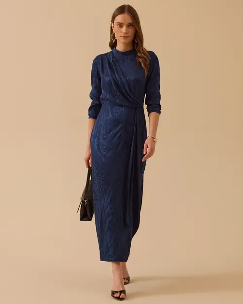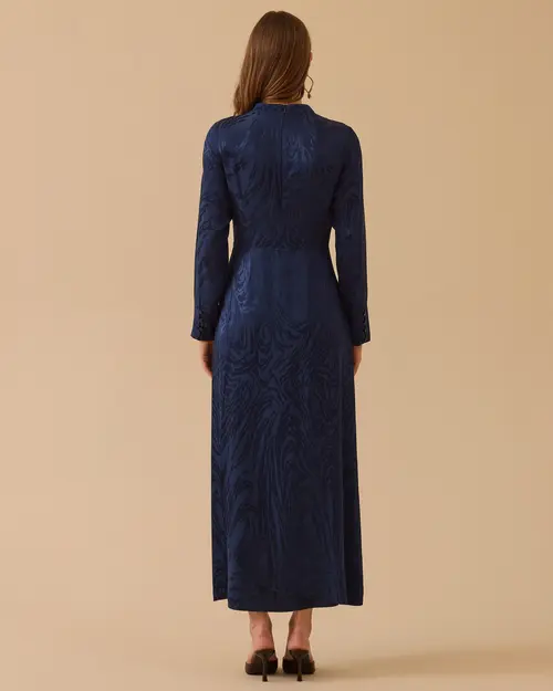 Desenli Parlak Dokulu Uzun Elbise, parlak dokusu ve zarif deseniyle özel anlara göz alıcı bir şıklık katar.