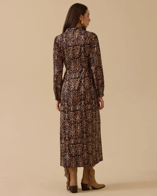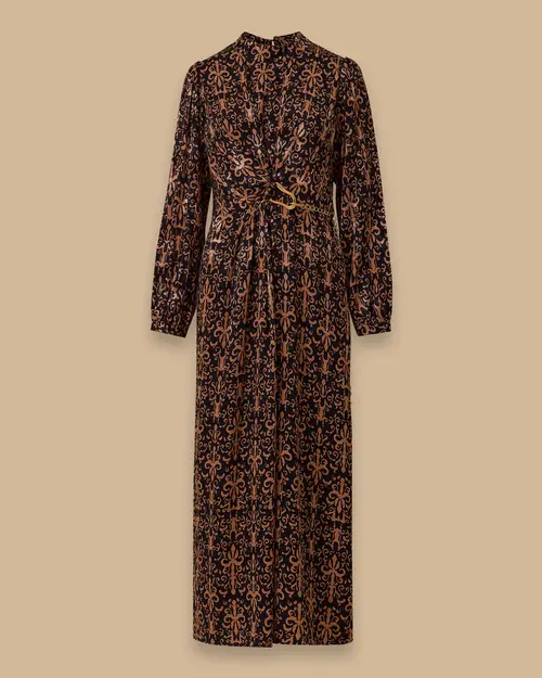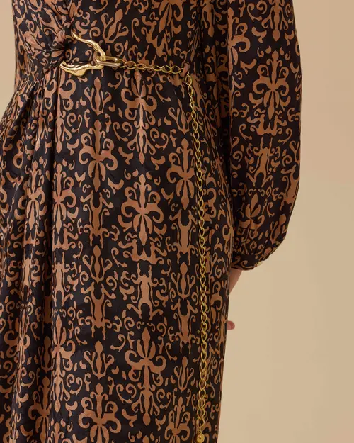 Desenli Zincir Detaylı Jakar Elbise, şık dokusu ve bel vurgusuyla zarif bir görünüm sunar.