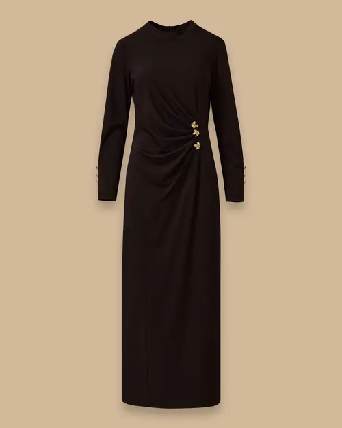 Metal Aksesuarlı Drapeli Krep Elbise, krep kumaşın dökümlü duruşu ve bel kısmındaki metal detayla birleşerek sade ama etkileyici bir şıklık sunar.
