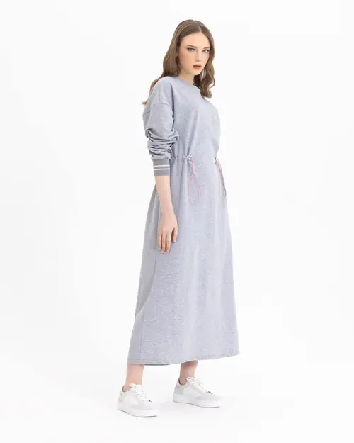 Sweatshirt kumaşın rahatlığı ile ön plana çıkan elbise, sırtındaki slogan detayı ile detaylanıyor. Belindeki bağcık ile feminenlik kazanan elbiseyi, sneakerlar ile tamamlayarak, spor ve şık bir stil yansıtabilirsiniz.