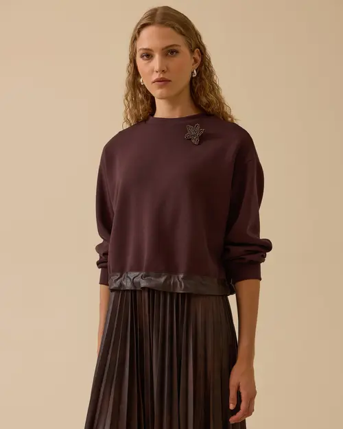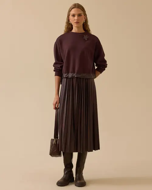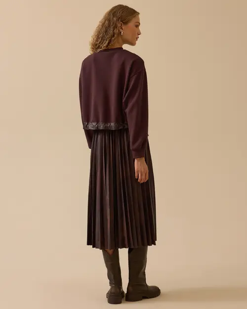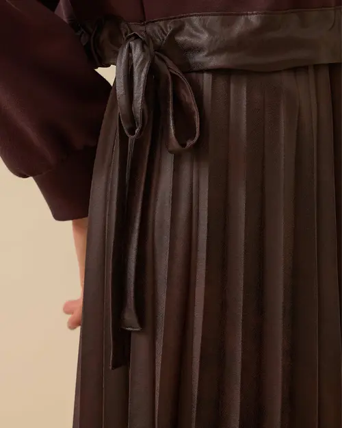 Taş Detaylı Suni Deri Pliseli Midi Elbise