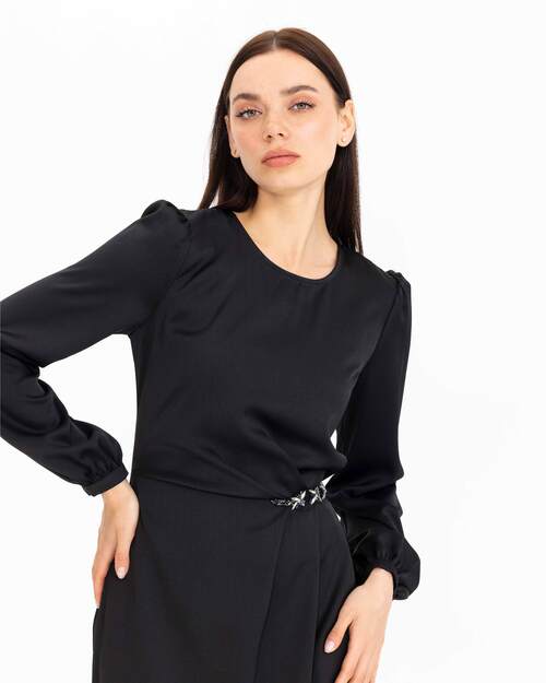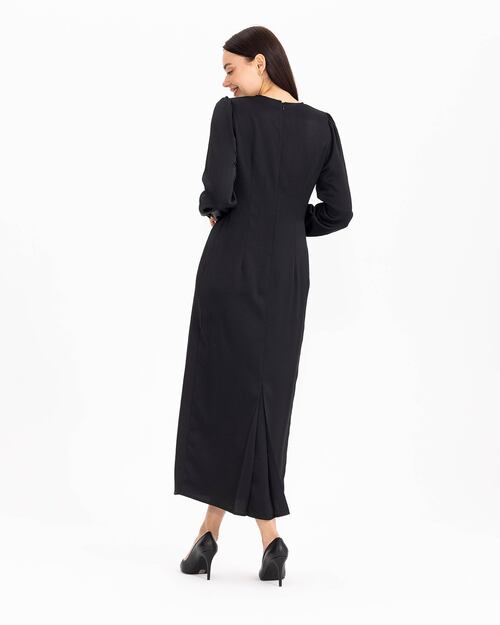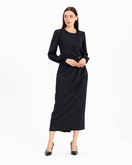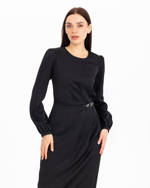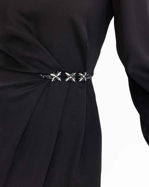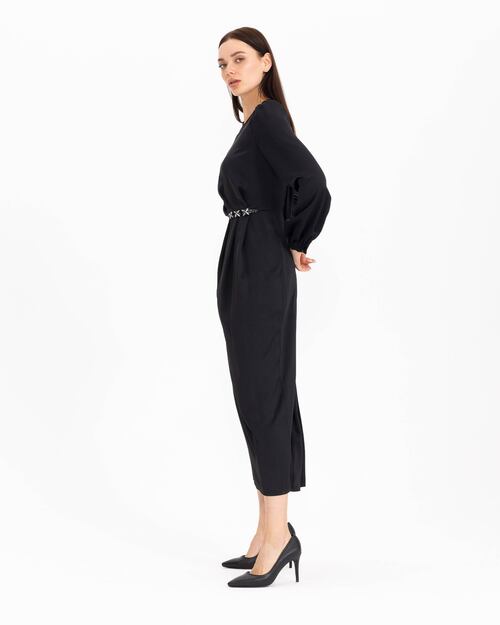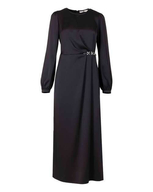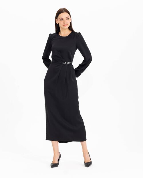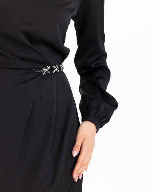 Beline işlenen taşları ile dikkat çeken elbise, saten görünümü ile şıklık kazanıyor. Uzun boyu ve uzun kolları ile konfor sunan elbiseyi, topuklu sandaletler ile tamamlayabilir, zarif ve şık bir silüet yansıtabilirsiniz.