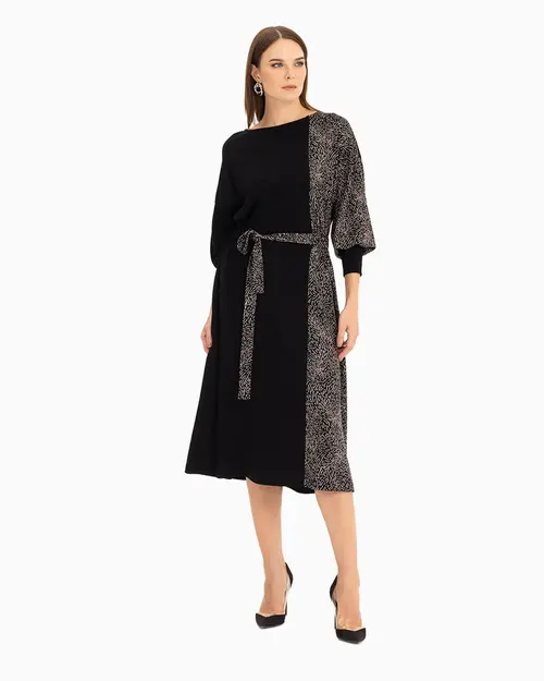 Desen geçişine yer veren elbiseye belindeki kemer detayı hareket katıyor. Midi boyuyla zamansız şıklığı yansıtan elbiseyi, topuklu ayakkabılarınızla tamamlayarak stilinizi yansıtabilirsiniz.