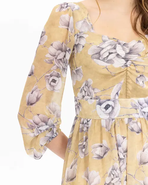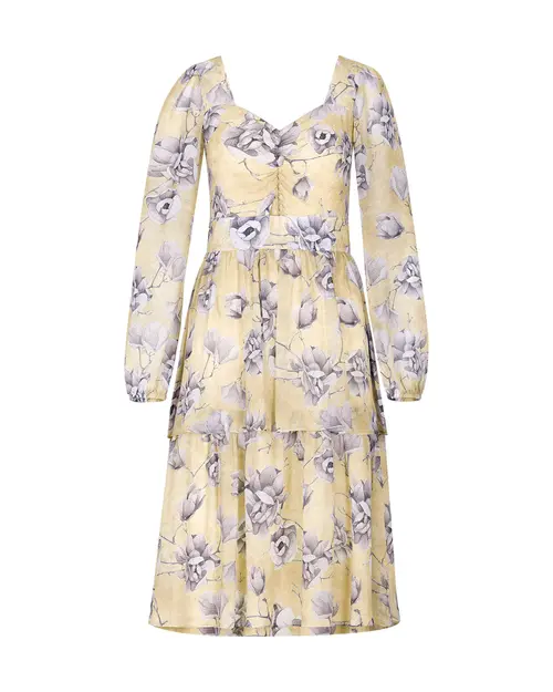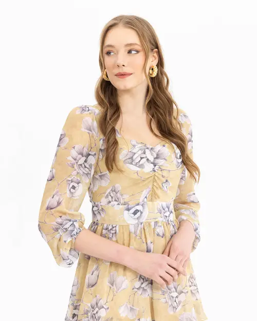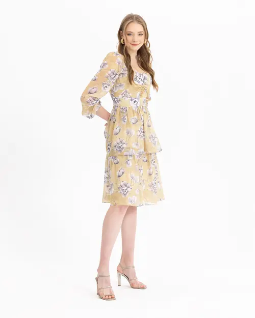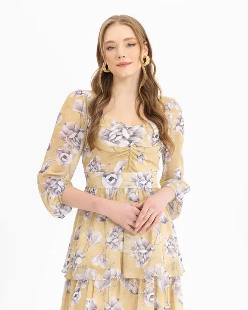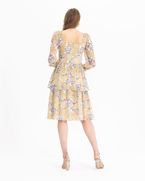 Kalp yakası ve deseni ile dikkat çeken abiye, katlı eteği ile hareketleniyor. Şifon formu ile şıklığını katlayan elbiseyi, topuklu sandaletler ile tamamlayabilir, şık bir stil elde edebilirsiniz.