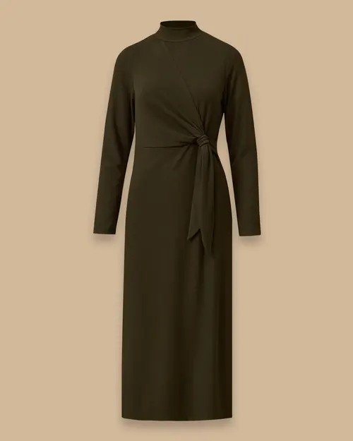 Dik Yaka Bağlama Detaylı Midi Elbise,beli vurgulayan detayı ve midi boyu ile konforlu bir görünüm sunar.