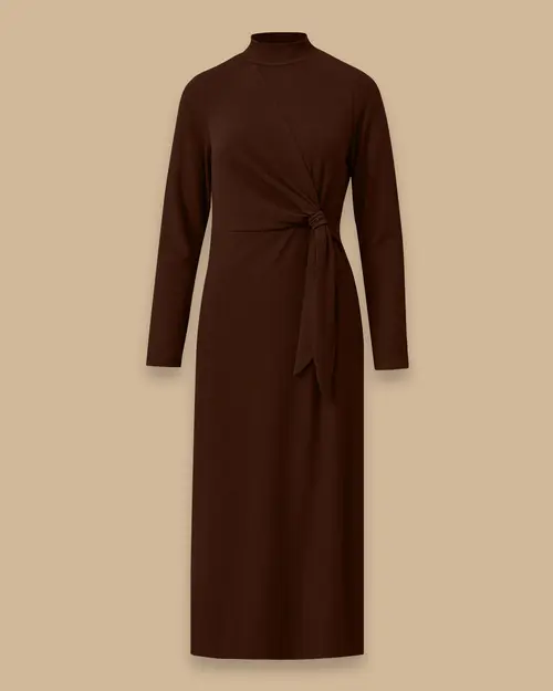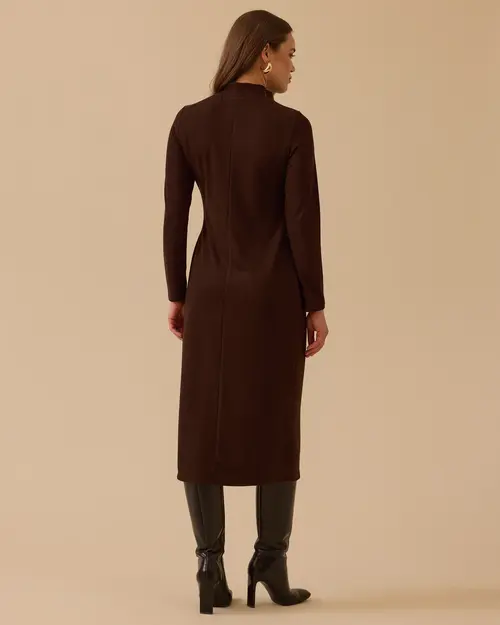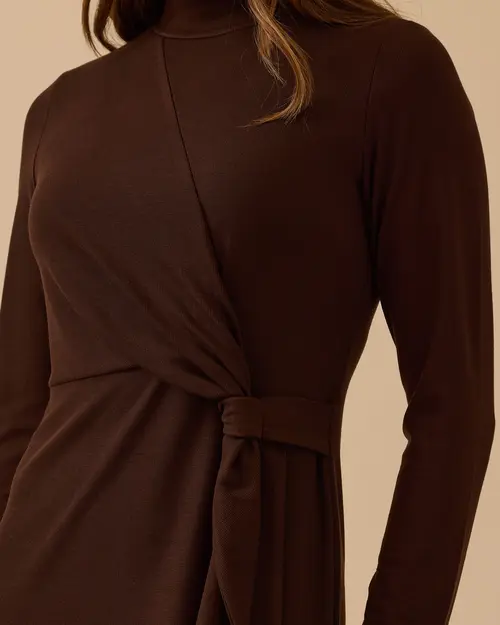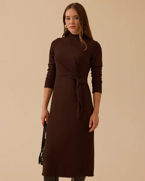 Dik Yaka Bağlama Detaylı Midi Elbise,beli vurgulayan detayı ve midi boyu ile konforlu bir görünüm sunar.