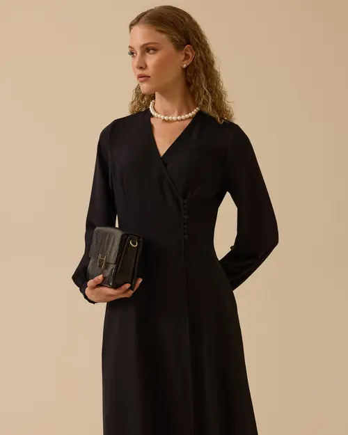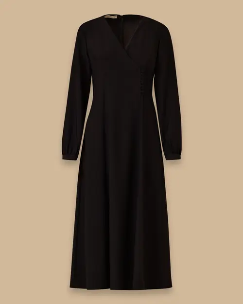Düğme Detaylı Kruvaze Elbise, sade tasarımı ve kruvaze yaka kesimiyle zarif bir görünüm sunar, ince düğme detaylarıyla şıklığını tamamlar.