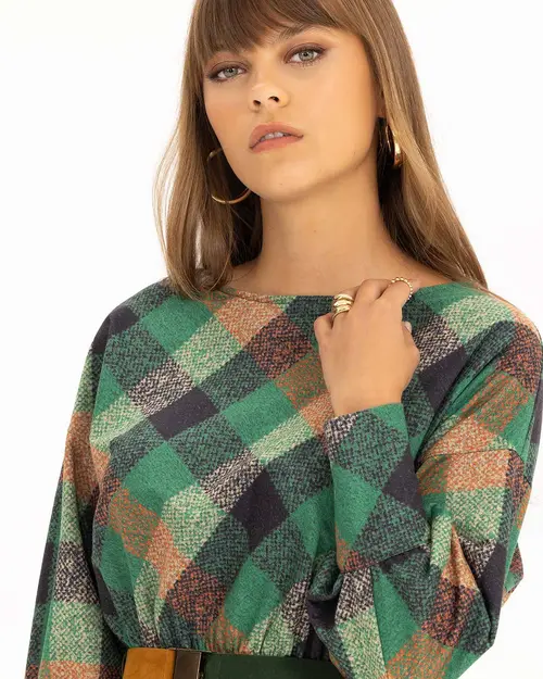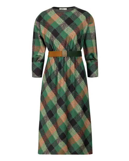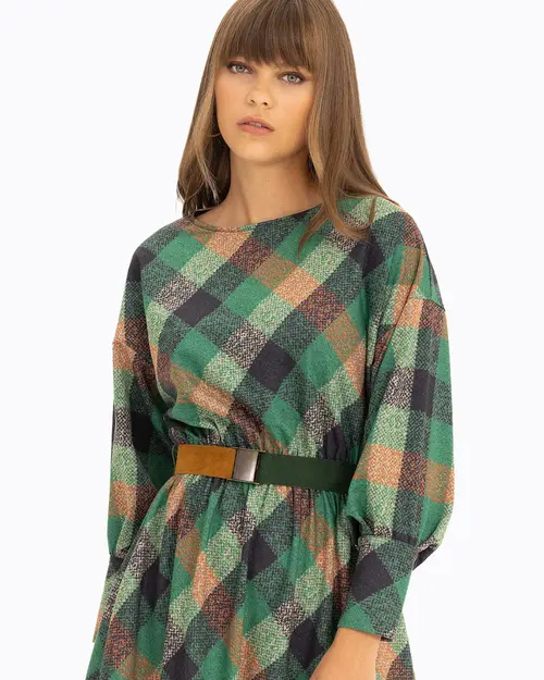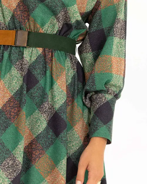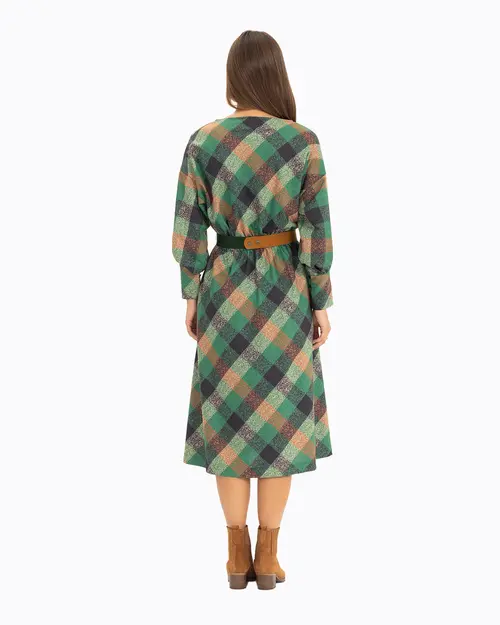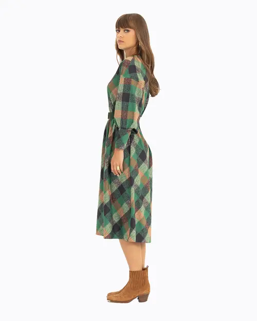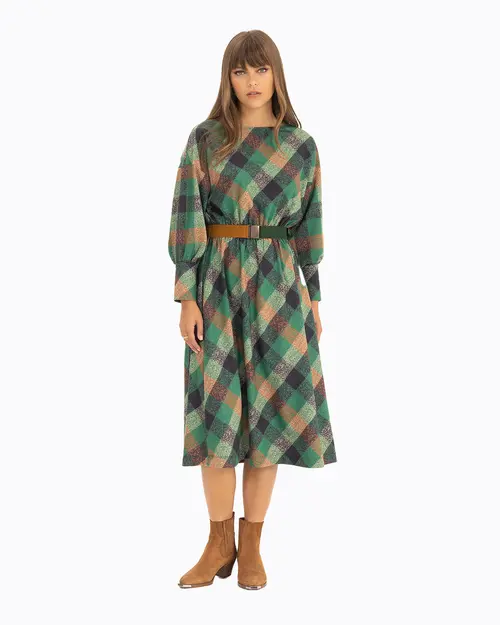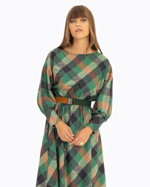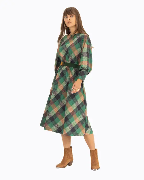 Ekose desenin hakimiyetindeki elbise, belindeki kemer detayıyla tek parçada şıklığı yakalıyor. Elbiseyi, süet topuklu botlarınızla tamamlayarak romantik bir stil elde edebilirsiniz.