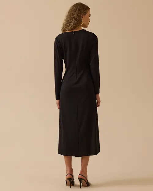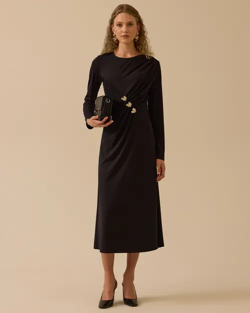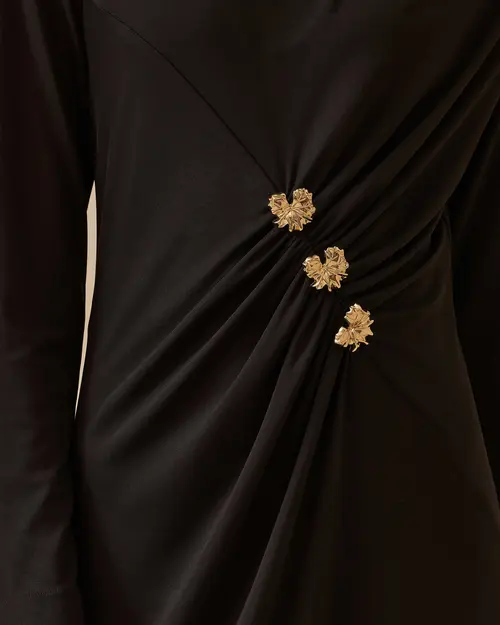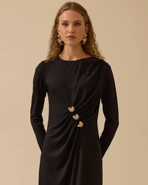 Gold Aksesuar Detaylı Drapeli Elbise, drapeli formu ve göz alıcı detaylarıyla öne çıkar.