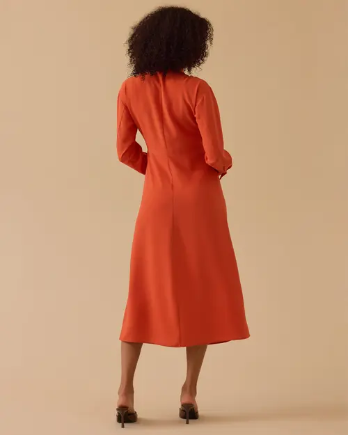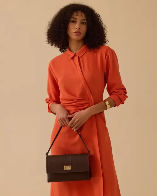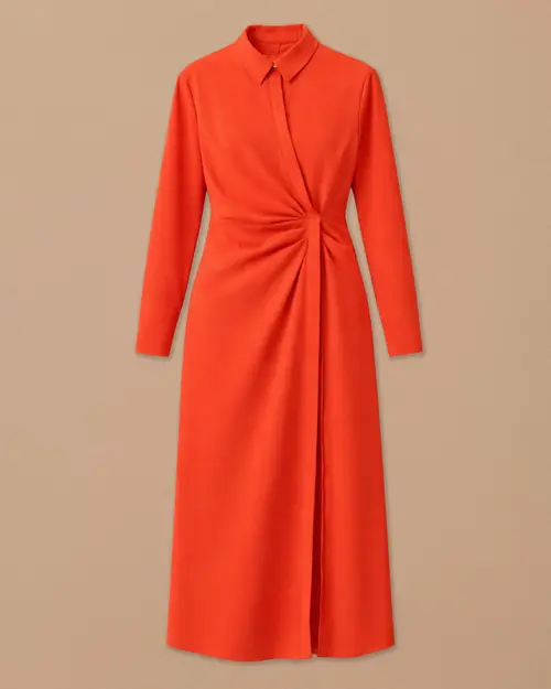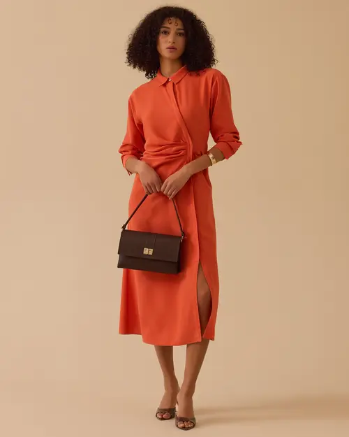 Gömlek Yaka Drapeli Elbise, klasik yaka detayı ve zarif drapeleriyle şık bir siluet sunar.