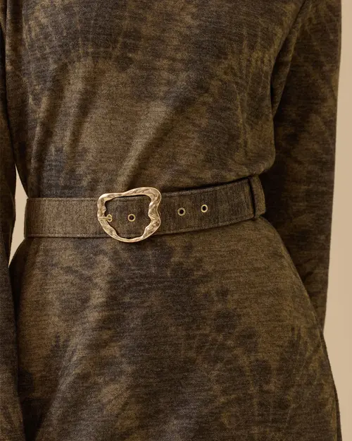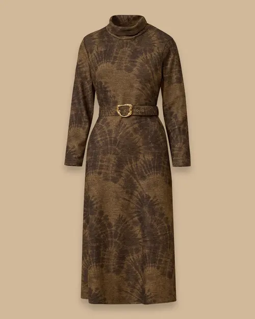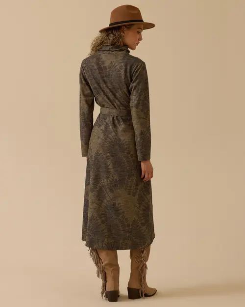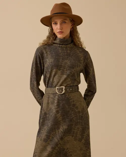 Kemerli Desenli Midi Elbise, zarif desenleri ve konforlu kalıbıyla şık kombinler için ideal.