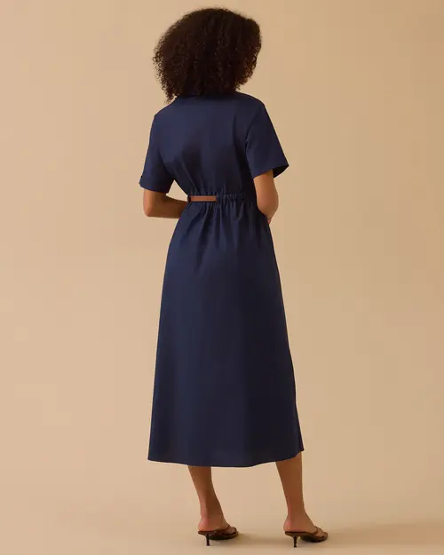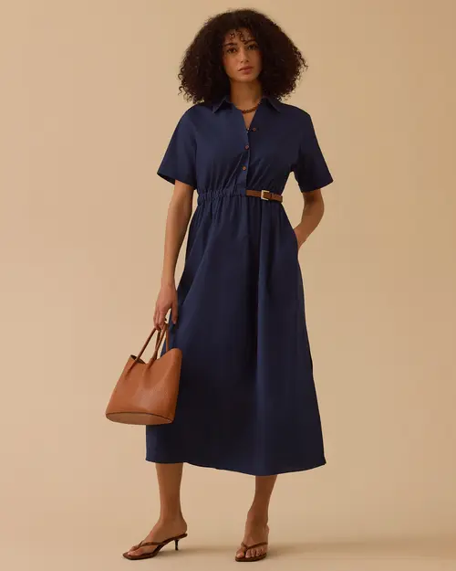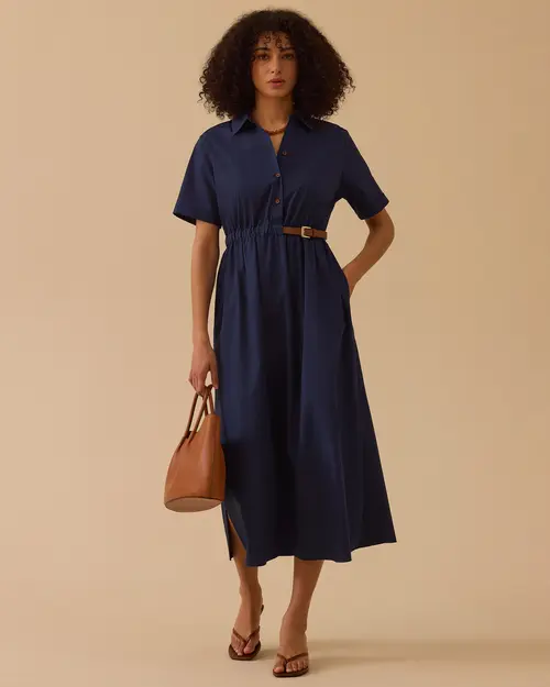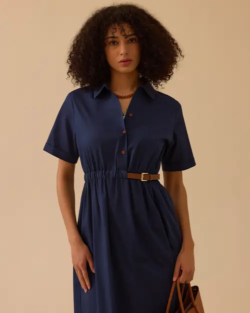 Kemerli gömlek yaka koton elbise, bel vurgusu sağlar, rahat kesimiyle gün boyu konfor sunar, şehir stiline modern uyum sağlar.