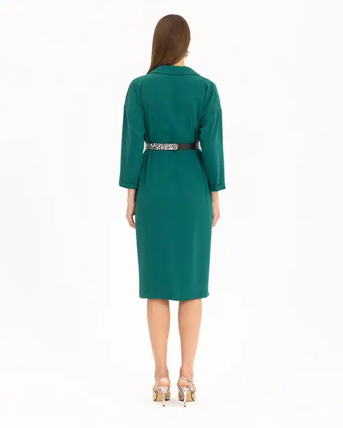 Belindeki kemer detayıyla dikkat çeken elbise, Sohbahar ruhuna rengiyle uyum sağlıyor. Stil sahibi modern kesimi ve kruvaze yakasıyla da davetlerde stilinizi yansıtabilirsiniz.