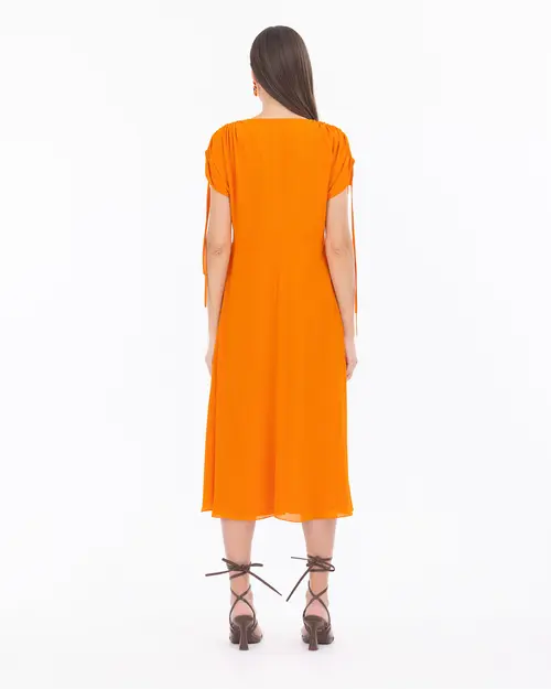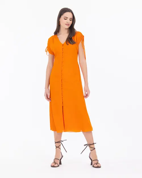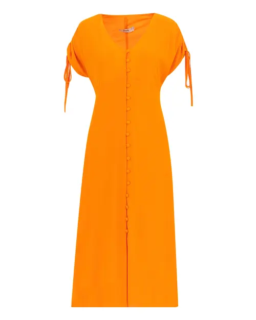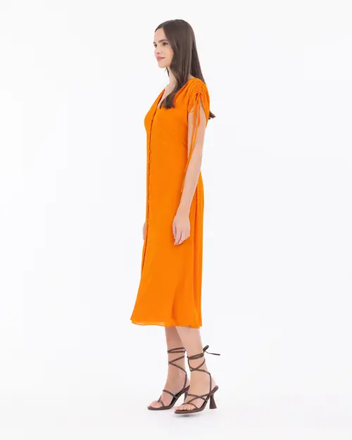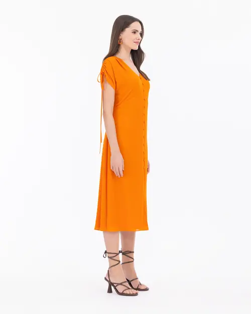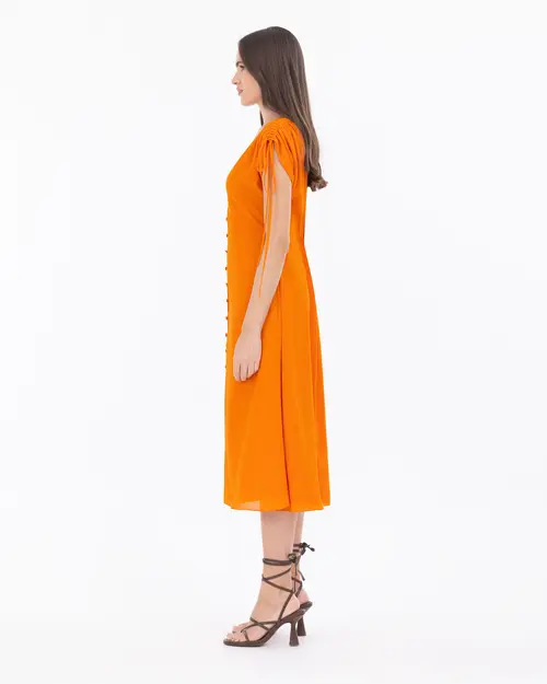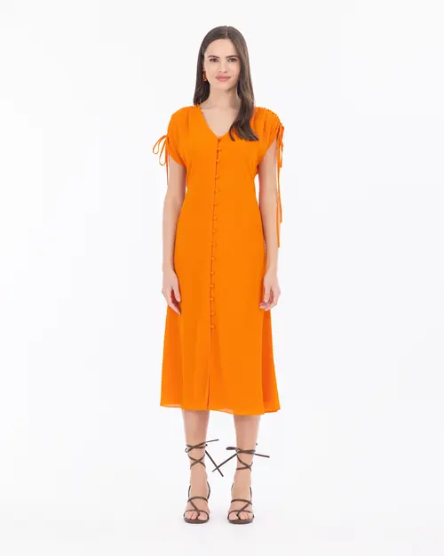 Önündeki düğme detayları ile dikkat çeken elbise, kolundaki bağcıkları ile hareketleniyor. V yakası ve midi boyu ile şıklık katan elbiseyi topuklu sandaletler ile tamamlayabilir, tek parçada şık bir stil elde edebilirsiniz.