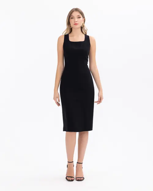 Bu midi boy elbise, kolsuz tasarımı ve dar kesimiyle dikkat çekiyor. Modern ve şık görünümü ile öne çıkan elbise, vücuda oturan formuyla silüetinizi vurguluyor. Özel etkinliklerden günlük ya da ofis kullanıma kadar çeşitli durumlar için mükemmel bir seçenektir.