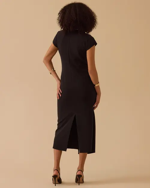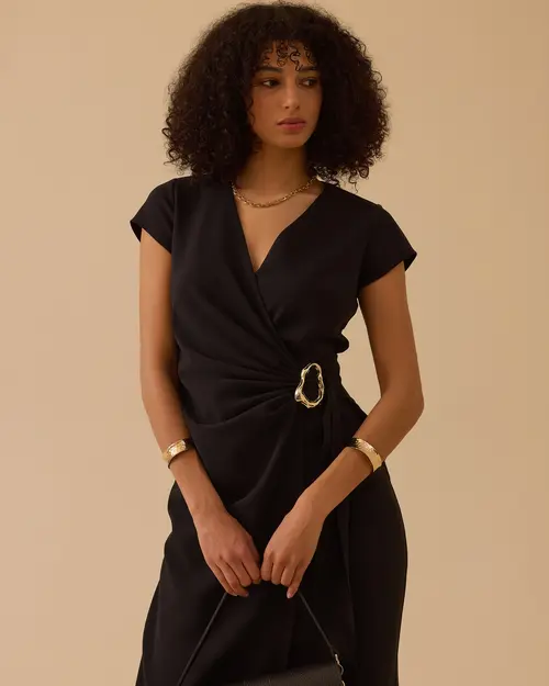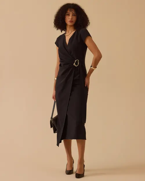 Kruvaze midi boy elbise, vücuda uyumlu kesimiyle dengeli silüet sunar, günlük şıklık sağlar, farklı ortamlara kolayca uyum sağlar.