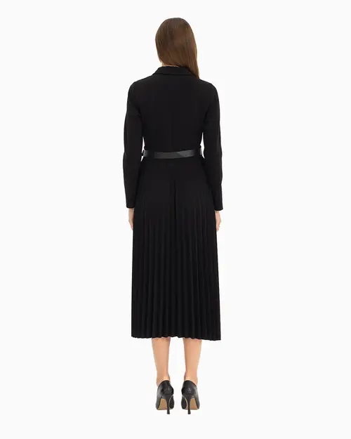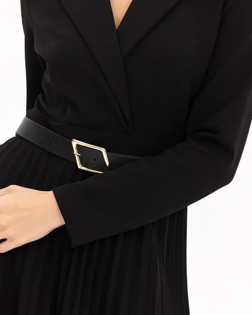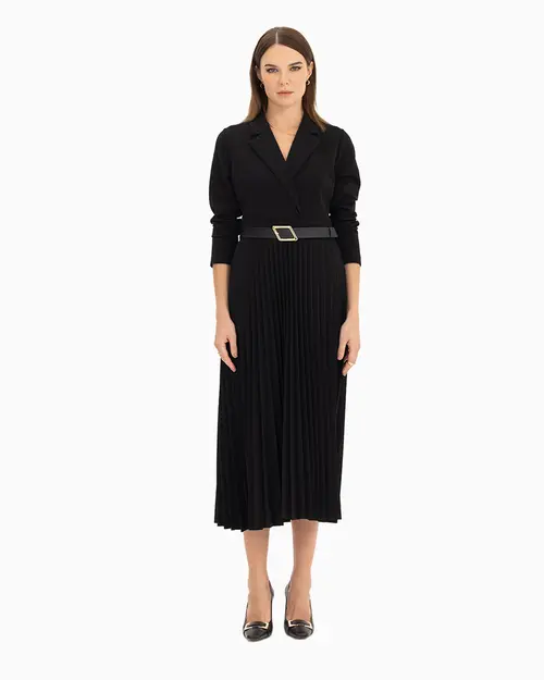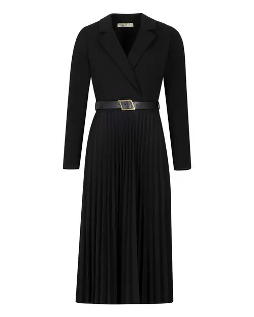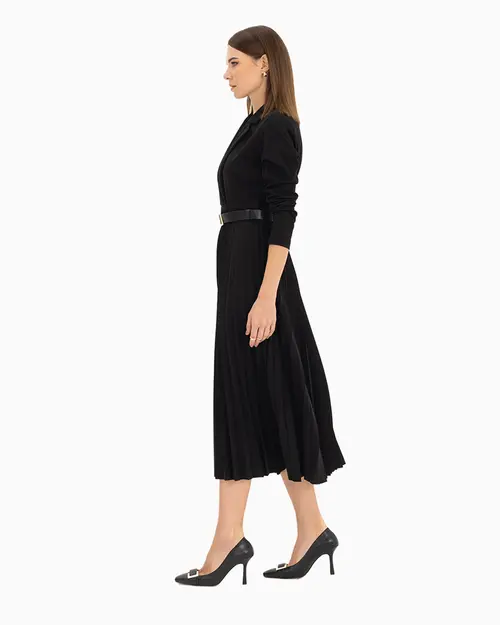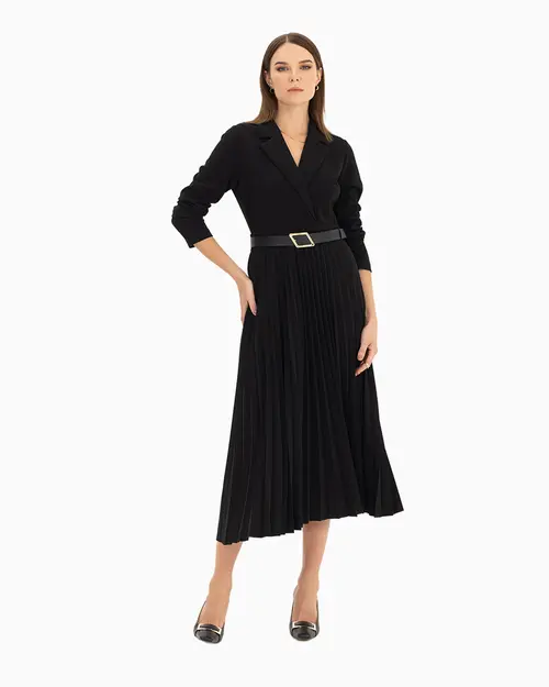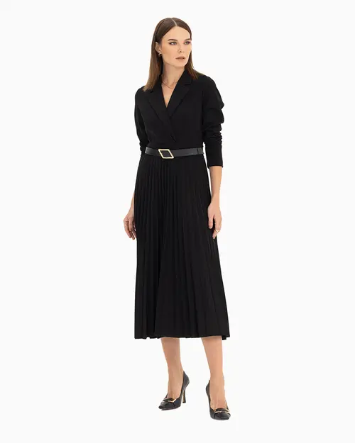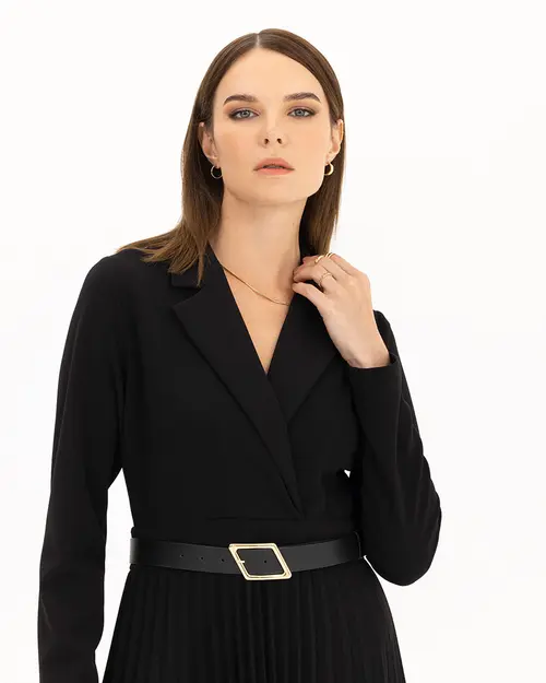 Modern ve klasik görünümün harmanlandığı elbiseye belindeki kemer detayıyla şıklık kazanıyor. Tek parçada şıklığın yansıtıldığı elbise kombininizi topuklu ayakkabı dokunuşu ile tamamlayabilirsiniz.