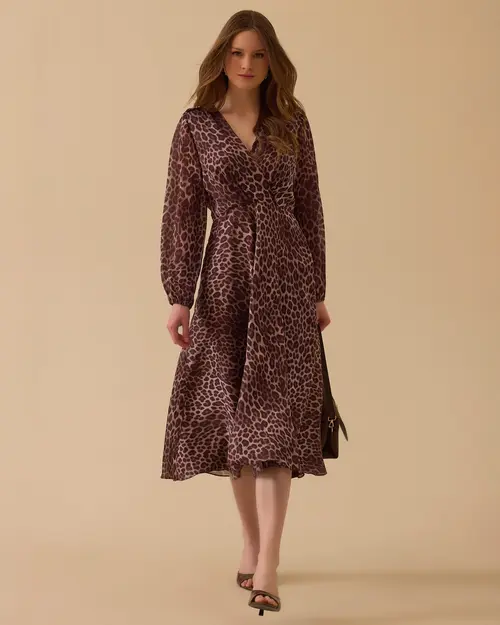 Leopar desenli A kesim şifon elbise, akışkan yapısı ve hareketli yüzeyiyle özel günlerde dikkat çekici bir duruş sunar.