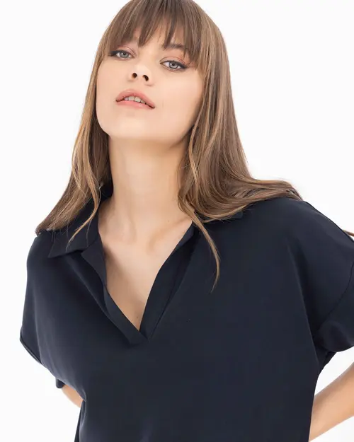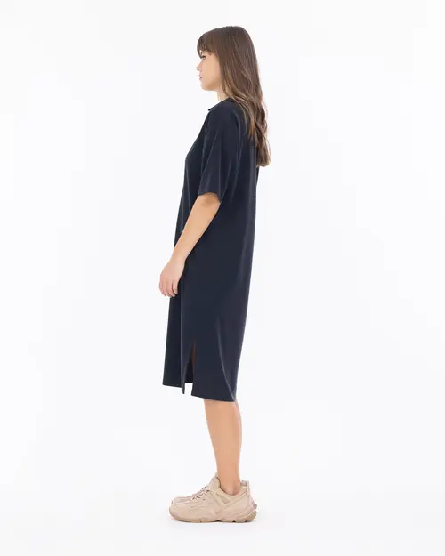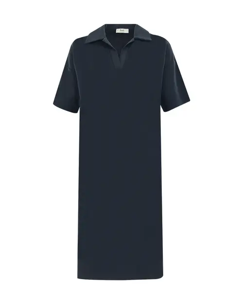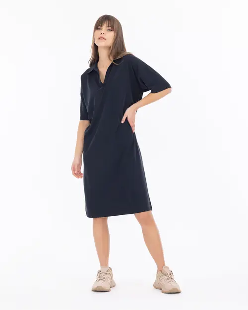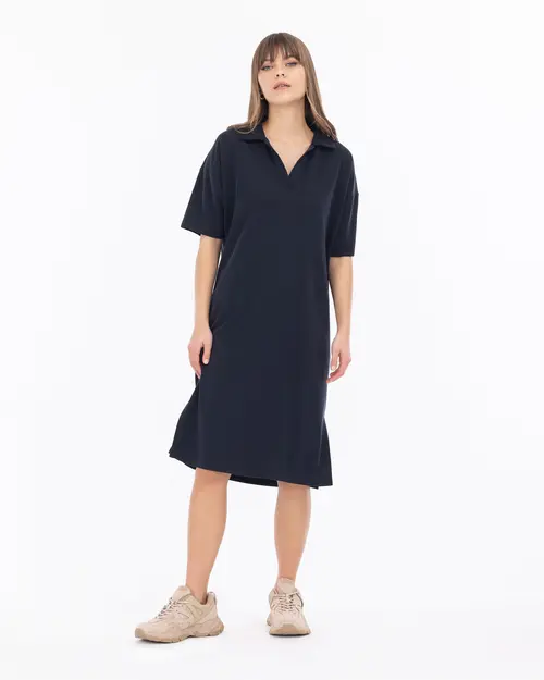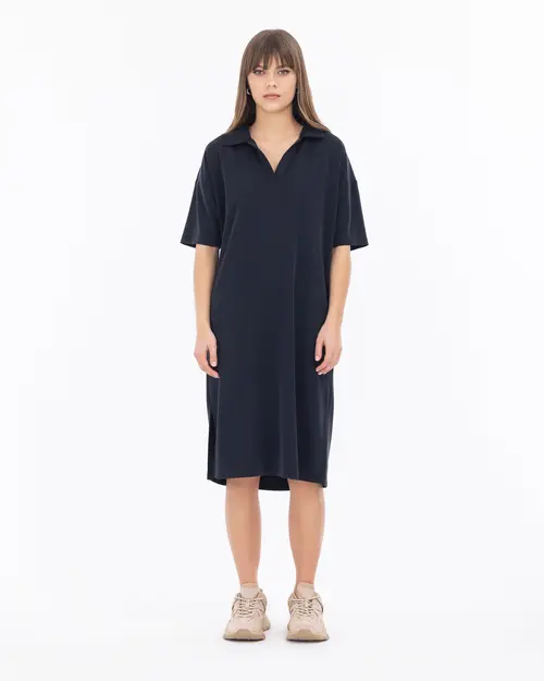 Rahat kesim elbiseler, yaz sezonunda sıkça kullanılan parçalar arasında yer alıyor. Örme dokusu ile konfor sunan elbise, polo yakası ile rahat ve şık bir stili garantiliyor.