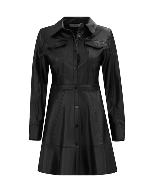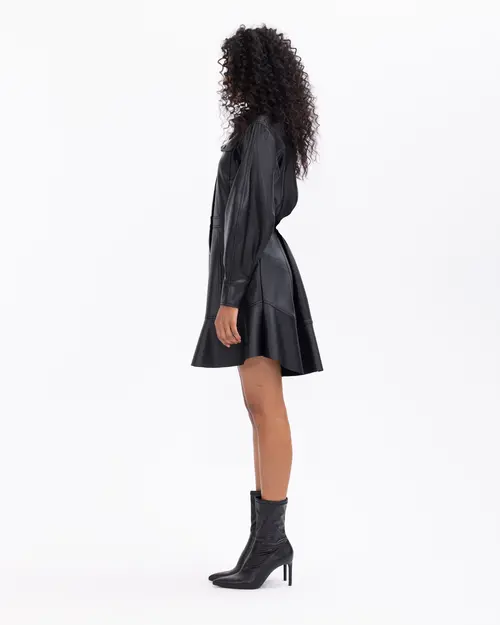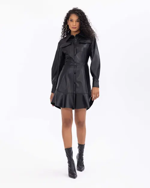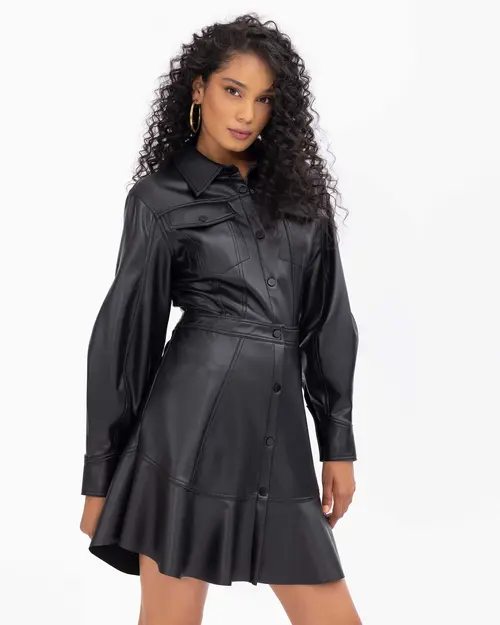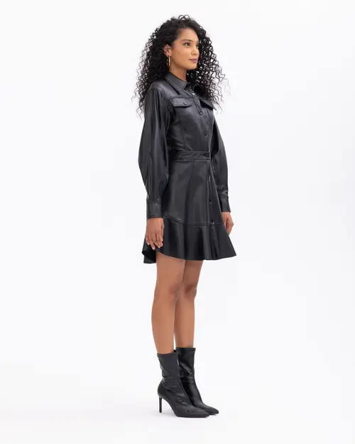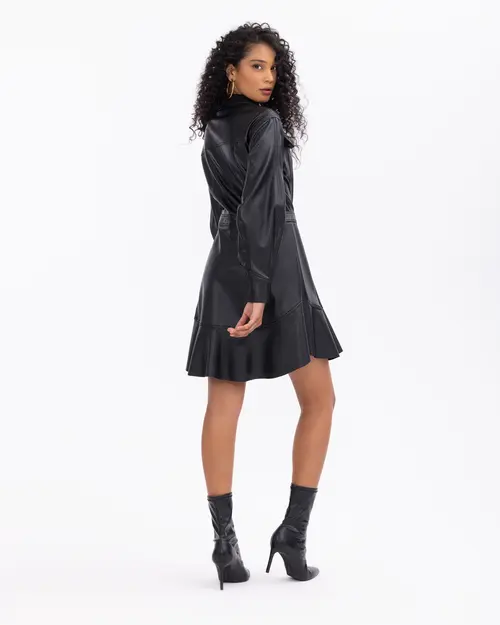 Suni deri volanlı gömlek yaka elbise, modern ve sofistike bir görünüm sunar. Suni derinin asil parlaklığı ve dokusu, volan detayı ile birleşerek feminen bir dokunuş kazanır. Gömlek yakası, klasik bir hava katarken, elbisenin genel tasarımı şıklığınızı ön plana çıkarır. Hem özel günlerde hem de günlük kullanımda rahatlıkla tercih edebileceğiniz bu elbiseyi gardırobunuzun vazgeçilmezi parçaları arasına dahil edebilirsiniz.