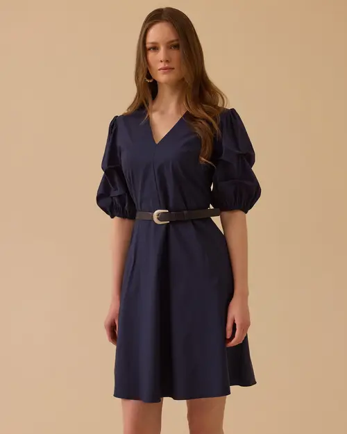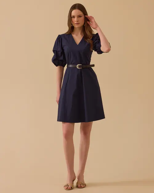 v yaka balon kol mini elbise
