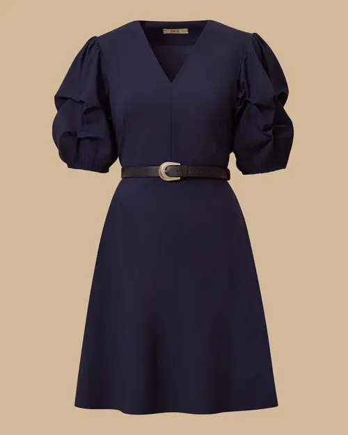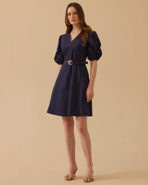 V Yaka Balon Kol Mini Elbise, zarif V yaka ve hacimli balon kol detaylarıyla feminen bir stil sunar.