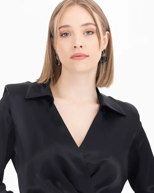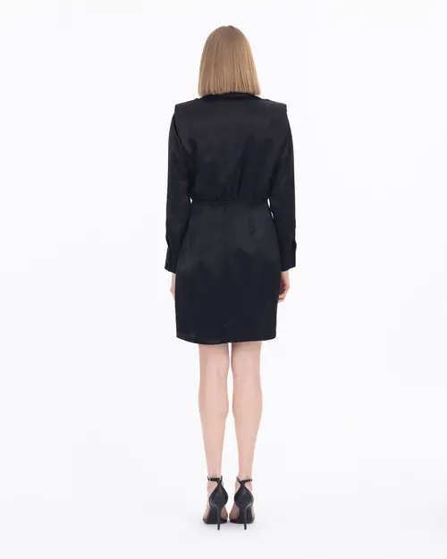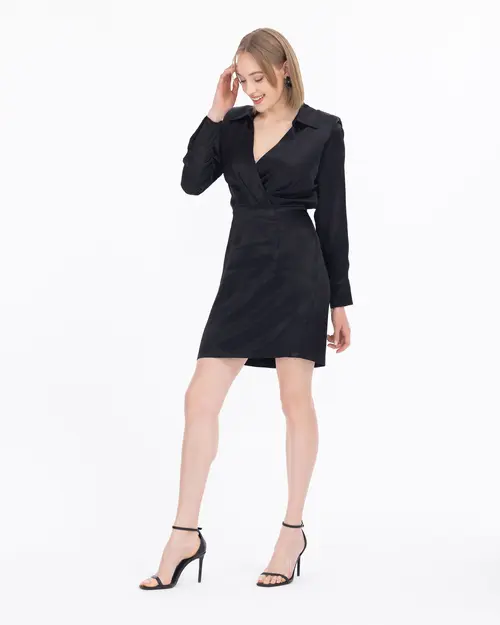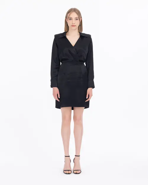 Kruvaze yakası ve vatkalı formu ile modern bir stil yansıtan elbise, saten görünümü ile şıklığını katlıyor. Vücuda oturan kalıbı ve kısa boyu ile feminen duruşu destekleyen elbiseyi, topuklu sandaletler ve şık takılar ile tamamlayabilirsiniz.