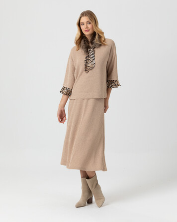 Bej rengini triko kumaş ile buluşturan modern bir etek. Çan formu ile bele vurgu yapan eteğin midi boyu ve dokusu zarif ve şık bir görünümü garantiliyor.
