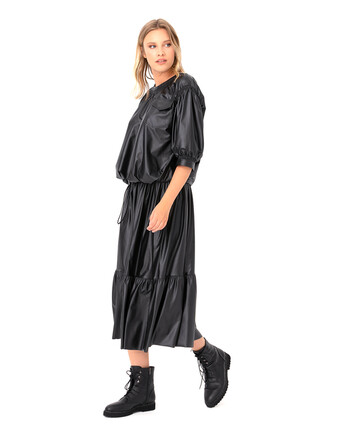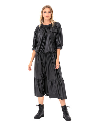 Deri görünümün şıklığını vurgulayan etek, volan detayları ile hareketleniyor. Eteği, aynı dokuya sahip bluzu ile kombinleyerek, şık bir stil yansıtabilirsiniz.