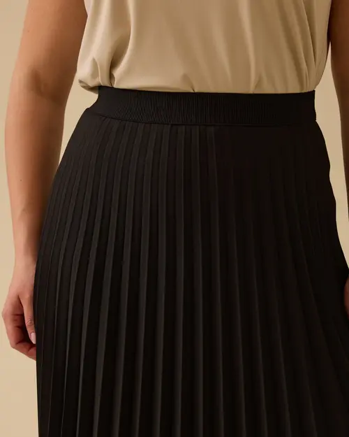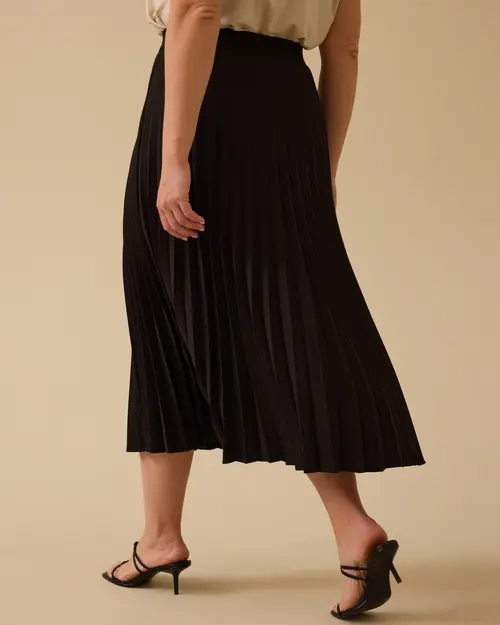 Büyük Beden Pliseli Midi Etek, zarif pile detaylarıyla hareketli ve şık bir görünüm sunar. Esnek beli sayesinde konforlu kullanım sağlar.