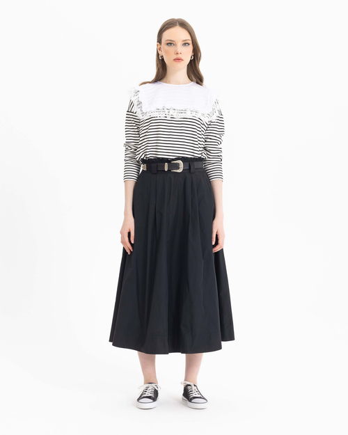 Kese kağıdı beli ve ince dokusu ile dikkat çeken etek, kloş formu ve midi boyu ile modern bir görünüm yansıtıyor. Eteği, çizgili bluz ve kemer ile kombinleyerek, dinamik ve şık bir görünüm elde edebilirsiniz.