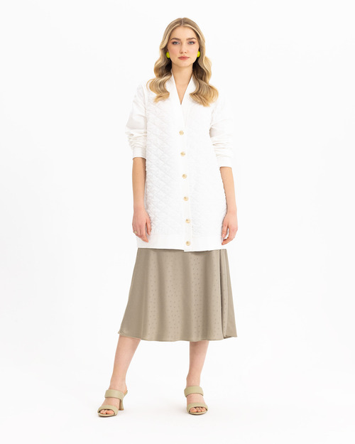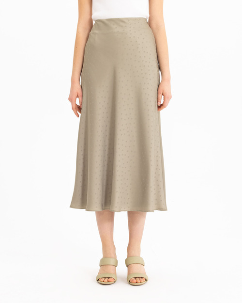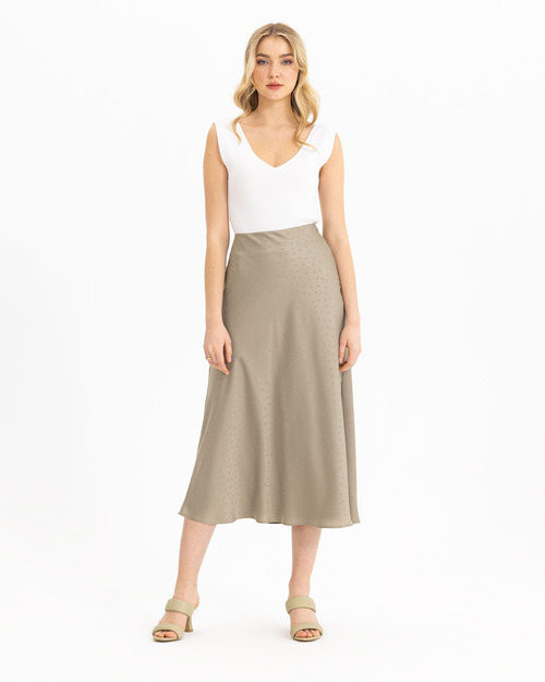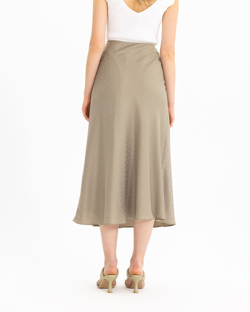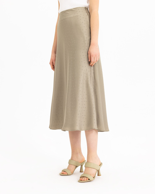 Saten görünümü ile şıklık kazanan etek, puantiye deseni ile dikkat çekiyor. Balık formu ile şıklığını katlayan eteği, kısa ceketler ile kombinlemeyi deneyebilirsiniz.