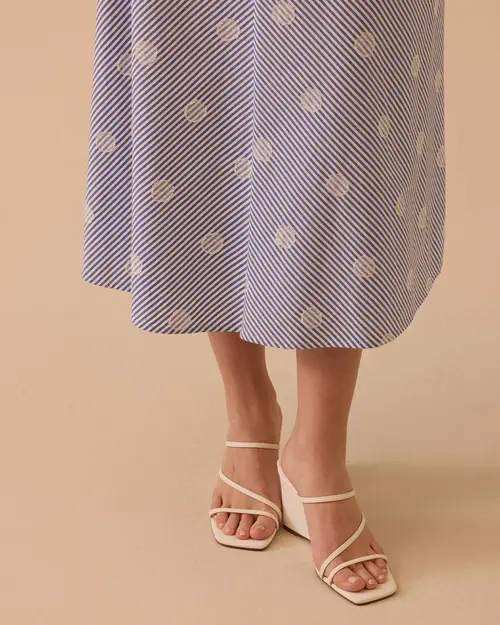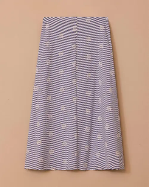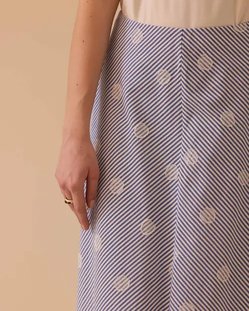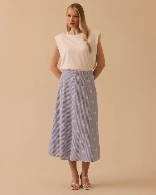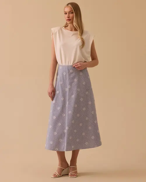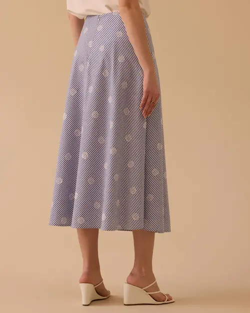 Çizgili Midi Etek, zarif çizgi deseni ve rahat kesimiyle günlük ve şık kombinler için ideal bir parça.