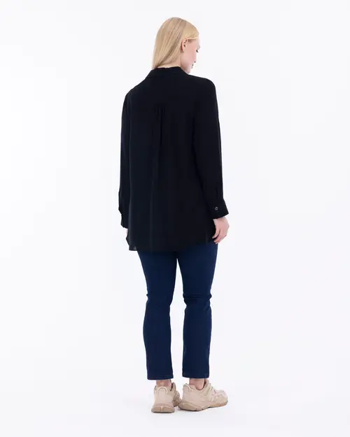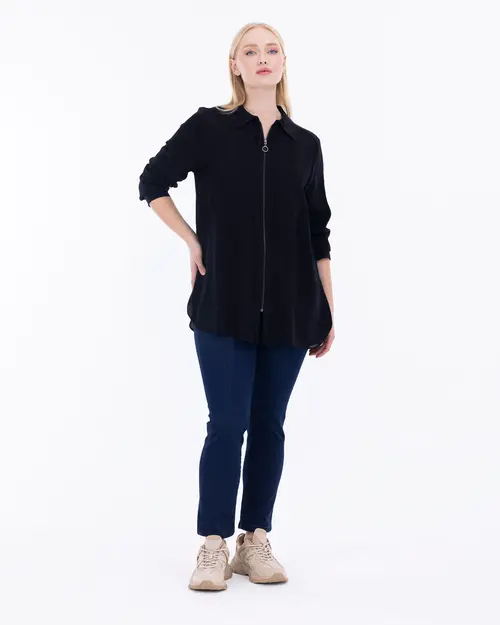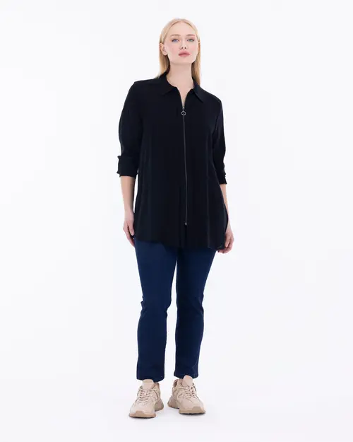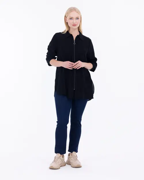 Önündeki gold renk fermuarıyla dikkat gömlek, baskı desenleriyle de hareketleniyor. Minimal şıklığı yakalamak için gömleği Sonbahar’a çok yakışan deri formlu pantolonlar ile tamamlayıp comfort casual görünüm yakayabilirsiniz.