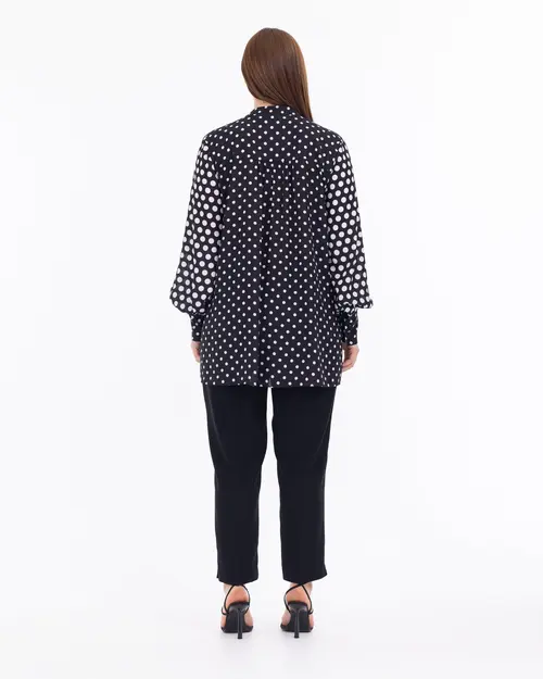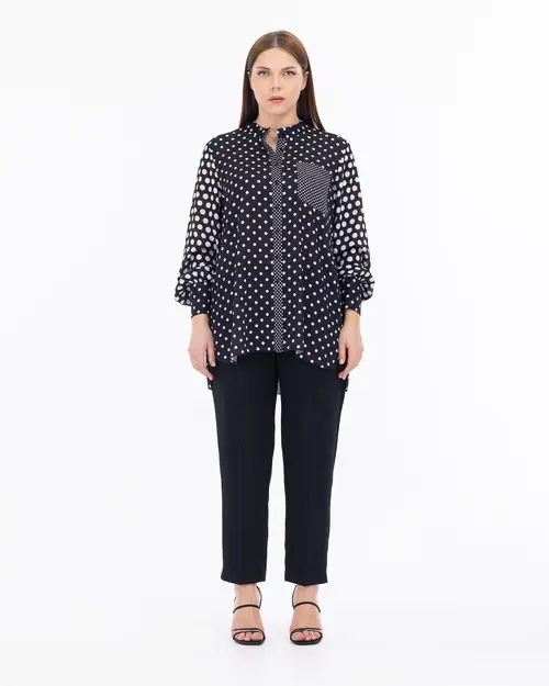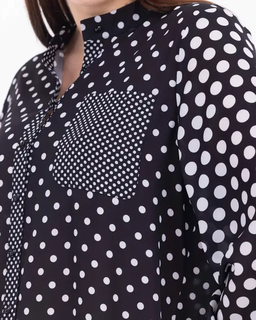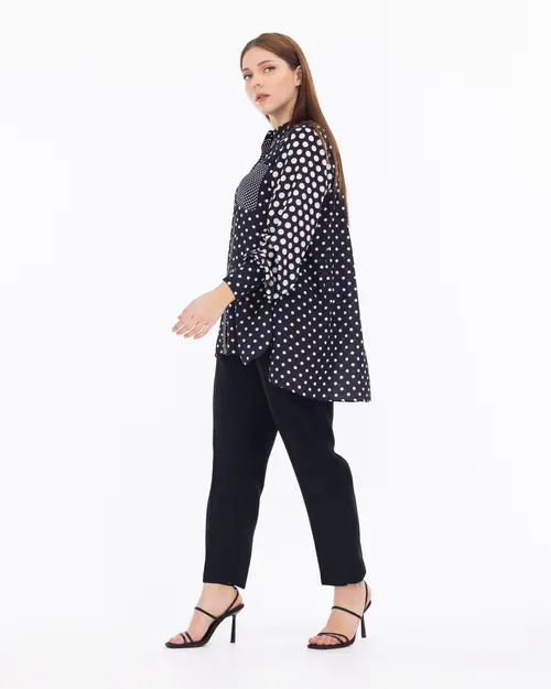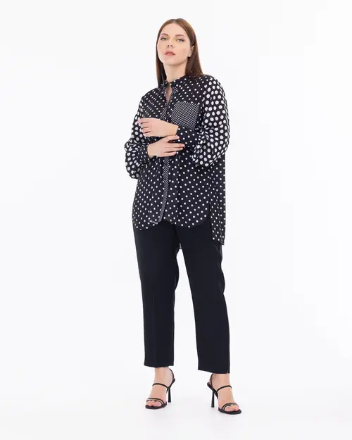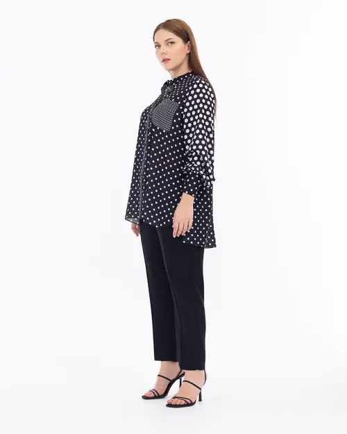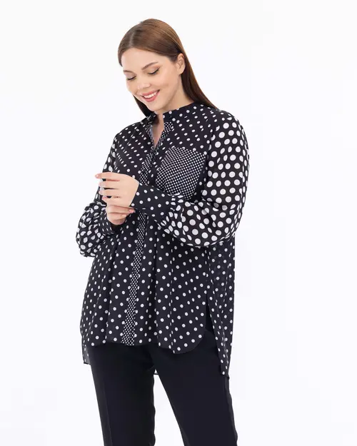 Puantiye deseniyle retro görünüşlere eşlik eden gömlek, şifon oluşuyla şıklığı beraberinde getiriyor. Cepleriyle de detay kazanan gömleği, klasik pantolonlarınız ve topuklu ayakkabılarınızla tamamlayabilirsiniz.
